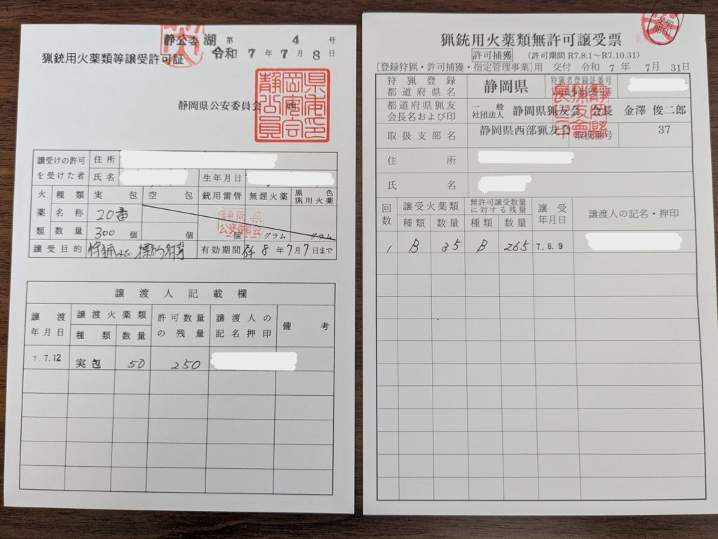 狩猟や標的射撃で使用する弾はこちらの火薬票を使って弾を購入します。1年間使える許可証。