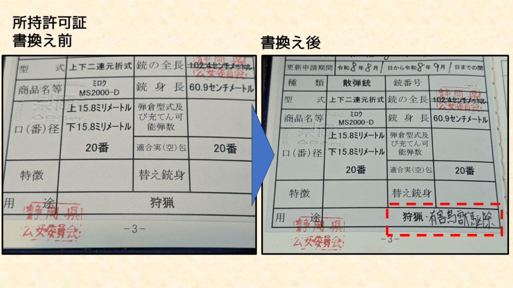 有害鳥獣駆除に参加する事と所持許可証の用途の書換えは別の手続きですので、