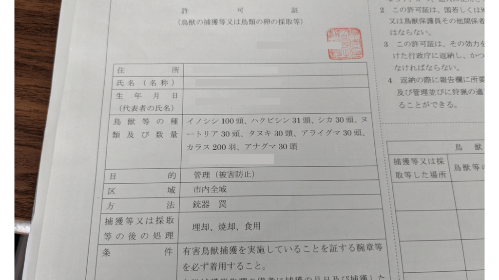 管理協会から市へ連絡頂くと、管理捕獲に参加するための許可証を発行頂けました。